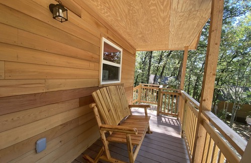 This cute little cabin sits down in a wooded holler near Winslow, AR, is 10 minutes from Devils Den State Park, and just 25 minutes from Fayetteville. Enjoy the quiet, peaceful woods with the amenities of a "tiny home" style cabin. BBQ grill, firepit, and picnic table at each cabin. Perfect for a quiet getaway for 1, 2 or the whole family. Great for a Razorback sports events and more. The front porch rocker has a beautiful view. The pond is fun for fishing, riding the "peddle boat" or a kayak. The playground is waiting for the kiddos. There are 6 cabins available so share with your family and friends and have a great gathering for the weekend. The cabin has WIFI, is stocked with linens, dishes, a smart TV & DVD player. You can easily get a data signal on your phone.