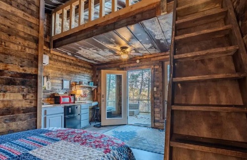 Beautiful retreat cabin for couples. Pics do not do this place justice. 224 sq ft. Has a full size bed downstairs and a queen size memory foam mattress in loft. There is a trail that leads to creek. There is a private beach area by the creek. There is no full kitchen but we have an outdoor grill. There is a microwave and kureig inside cabin. The cabin is pretty secluded for privacy and quietness. It sits at the dead end of the road. I live about 400 ft from the cabin. There is a large fire pit for you to use. The hot tub sits near the edge of the bluff and has amazing view of the creek. Feel free to gather up wood on the property to use for the fire pit. The bathroom consist of a shower, toilet and sink. There is an outdoor shower as well.