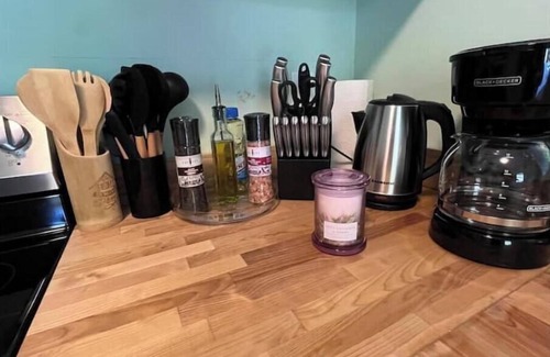 The kitchen, though compact, is well-equipped to meet your culinary needs. You'll find all the essentials: a practical stove and oven for cooking meals, a microwave for quick heat-ups, a handy coffee machine for your morning brew, and a refrigerator to keep your groceries fresh. It's perfect for whipping up simple meals or storing leftovers from your restaurant adventures.