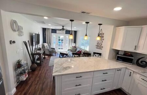 Inside, the home boasts an open-concept layout, featuring a large eat-in island in the kitchen, perfect for family meals or casual entertaining. Freshly painted and fully equipped with modern amenities, it’s the perfect spot to relax after a day at the beach.