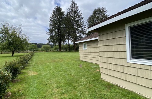 This 2 bedroom house is perfect for small families or couples. The house is located a quarter mile off HWY 101 and minutes away from the local grocery store & hardware store. It’s a perfect spot to stay for those traveling to explore local rivers, beaches and national and state parks. It is on a 1.5 acre lot with a beautiful view of fields. There’s 2 bedrooms (1 king and 1 queen), full bathroom with tub, living area with tv, 2 large sofas and a recliner. No access to washer & dryer on site but there is a laundromat less than 1 block away.