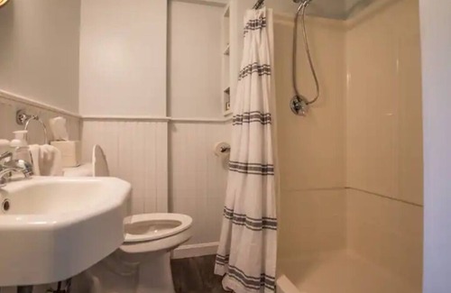 The full bathroom is on the first floor and has a large shower stall. Shampoo, conditioner, and soap are provided. The second half bath is located at the top of the stairs.