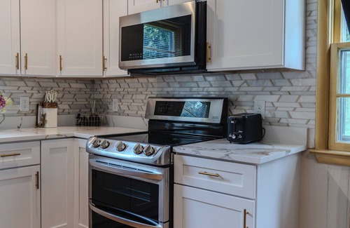 2 Kitchens. Cook like a pro in the modern kitchens with essential appliances and tools, including an electric in-counter cooktop, stove and oven, microwave, refrigerator, coffee maker, blender, and more.