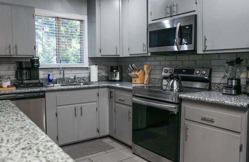 The kitchen offers a large island with granite surfaces and brand-new appliances. The coffee bar offers K cup station with 8 cups regular brew and French press complete with our favorite coffees. Everything you need to cook and serve a complete meal are available within the kitchen cabinets.