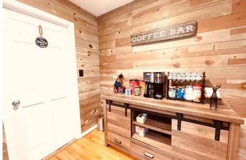 Fully stocked eat in kitchen, dining room and a coffee bar with Keurig coffee, regular coffee pot for brewing a large pot of coffee and a good selection of coffee.