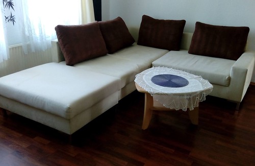 The apartment is located on the upper floor of the house shown. It is comfortably furnished and is approximately 80 m² in size. A relatively large balcony is available. Garden use is also possible. There are parking spaces in front of the house.