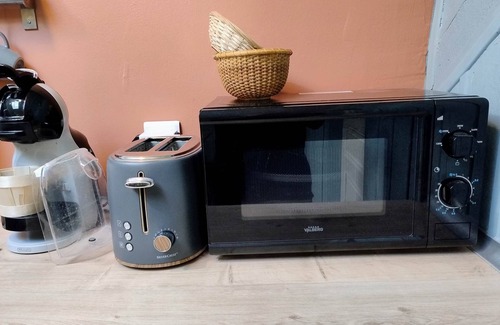 Fridge, microwave-grill, hotplates, coffee maker, toaster... and all useful kitchen accessories.