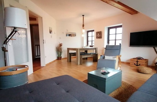 The apartment "Fernblick" is located in the attic (2nd floor without elevator) on our Resthof in Borghorst, only about three kilometers from the Baltic Sea beach. From the top you have the best view over the adjacent lands to the Noerer forest.