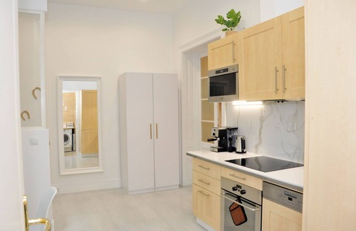 This lovely apartment has the kitchen and the bathrooms with everything what's needed during your stay(oven, microwave oven, dishwasher, cofee machine, electric kettle, fridge, glass hob, toaster and washer dryer, hair dryer and iron in the bathroom).