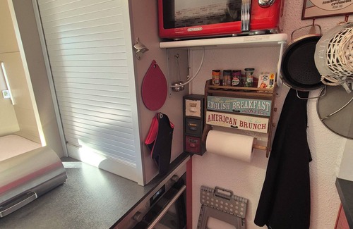 Functional kitchen with hob, oven, dishes, utensils. The living room has a foldaway bed with a comfortable mattress, sleeping area with a bunk bed (sleeps 2), bathroom with WC.