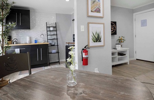The living room flows into the dining room and kitchen area. The dining area has a small bistro table with seating for 2 for an intimate meal. The kitchen features a new oven and stove, full-sized refrigerator, microwave and sink. Of course, there is also the coffee bar with a Keurig, cream and sugar. The kitchen is stocked with dishes, cookware, seasonings and olive oil.