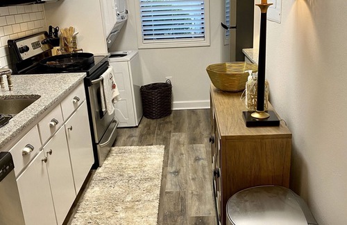 The unit, complete with new flooring and granite/quartz countertops, is freshly renovated for maximum comfort and cleanliness. Both bedrooms feature king size beds with pillow top mattresses and luxury linens, smart TVs with Apple TVs & private full bathrooms. We have provided a self inflating elevated queen air mattress with extra bedding and linens should you need to sleep more than 4 guests, (which can be set up orior to your arrival, upon request). To enjoy the beautiful Athens weather, the property has a back patio that is perfect for your morning cup of coffee or your tailgate with family and friends.
