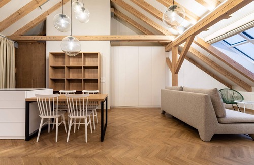 Welcome to this beautiful, fully-equipped attic loft offering all the modern comfort for your stay in Prague. With 65 m² of stylish living space, the loft features a spacious king-size bed and a comfortable pull-out sofa, making it ideal for couples or small families. It accommodates up to 4 guests.