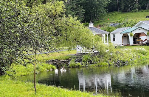 This small but marvelous one room plus porch cabin between 2 ponds, in East Meredith NY, is a cozy retreat for guests looking to unwind. It is a comfortable king bedroom, WiFi, AC, TV, microwave, coffee station and a hair dryer, this charming property has everything you need for a pleasant stay. The separate but private inside full bathroom/shower/laundry is a few steps away from the cabin (paved path). The peaceful surroundings and convenient amenities make it a tremendous choice for your vacation. You're sure to make fantastic memories with a stay at our place.