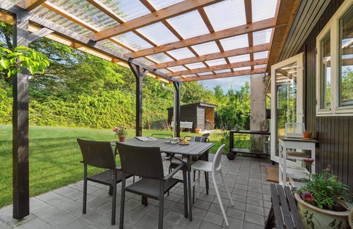 Just a few hundred meters from the Limfjord, this inviting vacation home welcomes you in a hilly, gently rolling landscape. The lovingly decorated interior makes a charming impression and provides the perfect setting for a relaxing family vacation. Enjoy vacation meals in the bright conservatory overlooking the greenery and spend sociable evenings in the living room with the crackling sounds of the fireplace in the background. The idyllic garden offers several terrace corners and a green area for fun and games.
