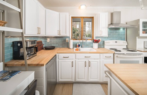 KITCHEN: Updated cabinetry | Ceramic tile backsplash | High-end finishes | Dine-in banquette bench seating | Island for extra seating storage | Fully stocked with kitchen essentials | Dual coffee maker/espresso machine