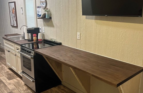 Enjoy the comforts of home with a fully equipped kitchenette that features a countertop, kitchen sink, oven and stovetop, microwave, refrigerator, and coffee maker—perfect for preparing meals during your stay. Kick back and unwind with the 42-inch smart TV, ready for streaming all your favorite shows.