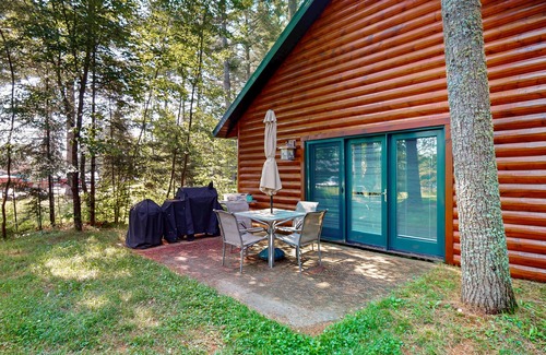 The cabin features a queen bed in the master bedroom, a queen bed in the second bedroom, and two futon sleepers in the spacious living area. The outdoor patio area is a guest favorite—ideal for sipping your morning coffee while listening to loons or winding down with lake views at sunset. A flat-screen TV with DirectTV & HBO, and a DVD player, to keep you connected when you want it.