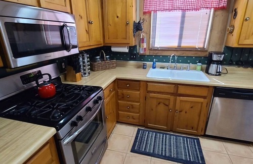 Enjoy the comfort of a fully equipped kitchen which includes a natural gas oven and range, and a large refrigerator with an ice maker and filtered water dispenser. The cabin also includes a Front-Load High Efficiency Washer and Dryer, a dining area, a spacious living area, and cozy pillowtop mattresses that promise restful nights of sleep. There are baseboard heaters in every room, along with a gas fireplace in the living room that keeps the cabin cozy and warm during the winter months.
