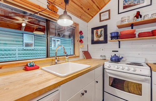 The contemporary interior boasts a compact full kitchen, comfortable home furnishings, a private washer/dryer, mini-split air-conditioning, and smart TV streaming (with your own account(s)). Board games are also provided for low-key family fun.