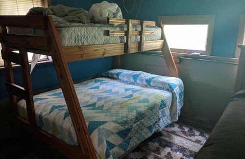 Located on a 1 acre lot. Our home has a fully equipped kitchen upstairs with an open kitchen and living room. The living room has a TV and a sectional. The bedroom upstairs has a king bed and there is a bathroom upstairs with a shower and a tub. The bottom entrance has a bathroom with a shower and one bedroom with a bunk bed that has a double bed on the bottom and single on top and a queen bed is in the room also.