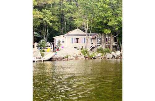 Small two bedroom cabin with 150' of frontage and a 35' dock for your boat. Great bass fishing, white perch and pike. Pet friendly. BBQ grill on one deck for grilling. Access the water from the dock or the walk in path. There is a fire pit for nightly campfires and the wood is provided. Enjoy the sunset with a drink on either of the two porches. Water is lake drawn so bring drinking water, other than that fully furnished with linens, cookware, and everything you will need for a vacation away!