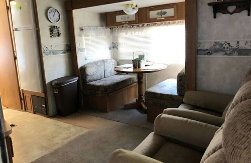 Cozy camper with sunroof and sounds of the ocean, sleeps 4 with a full bedding and 2 singles, has a full kitchen, bathroom (shower, toilet, sink) and is located in Rogers Bay Campground, North Topsail Beach, with access to the Intracoastal (ICWW) Waterway and the beach. The campground has a community pool (seasonal), bath houses, laundry room and nearby Beach Bum Grill. Just a 5-10 minute leisurely walk to the beach.