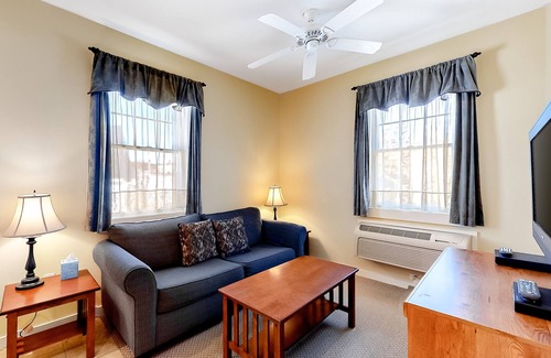 Escape to the darling New England town of Northeast Harbor at this comfy and clean, second-story suite. This casual, recently updated getaway includes a kitchenette for brewing up your morning coffee as well as storing and reheating last night's leftovers. Settle into your living area, or climb into bed and watch a show or movie on one of two cable-equipped, flatscreen TVs. And as this vacation rental is situated directly above Colonel's Restaurant and Bakery, you're always just a few steps from great food, great coffee, and excellent local brews.