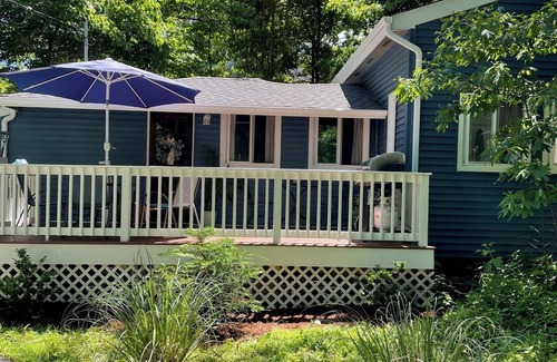 Rustic, charming cottage nestled in the woods yet steps from your private Sound beach. Enjoy beautiful sunsets over the water and great swimming as well as kayaking and fishing. This Cottage is in a much more private, quiet and wooded area than other nearby communities. Updgraded stainless steel appliances and new washer and dryer. Spend the day at the Sound then grill your dinner on the deck! Mere minutes from the Riverhead Cider House, North Fork vineyards, farms, restaurants, golf, Splish splash water park and Tanger Outlet Mall. This is a unique, community comprised of mid-century cottages and homes offering a serene escape yet just a short ride to the Hamptons. Two bedrooms and a full size futon in the living room allows for six guests. Cottage has air conditioning (window units) as well as heat.