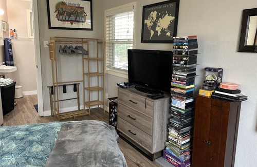 The studio area has a queen-sized bed, a TV with antenna and a Roku with Netflix, Amazon, HBO, etc. apps. There is a window unit a/c and space heaters.