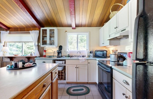 The kitchen is fully stocked with all the necessary appliances and cookware for your cooking needs. Enjoy a meal with a view of the ocean from the dining area.