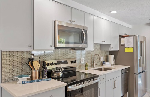 16. The kitchen is fully equipped with all new stainless appliances, including refrigerator with ice maker, dishwasher, electric range, oven, and microwave. Dishes, pots & pans, utensils, toaster, blender and coffee makers (Mr. Coffee and Keurig) are provided.