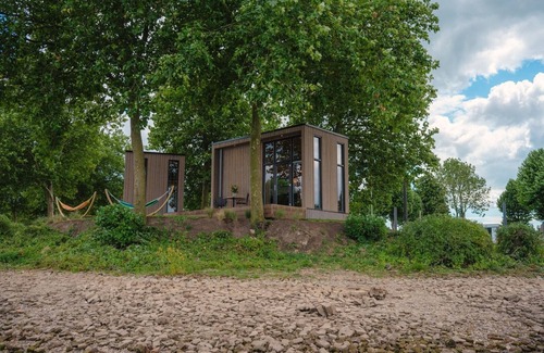 Back to basics, but provided with everything you need for an unforgettable stay. Our new Tiny Houses are cozy, modern, and compact. Fully enjoy the amazing view, because these homes are on the tip of a headland and are surrounded by water. Right next to the Nederrijn with a unique view of 2 marinas, multiple beaches, and an opposite island. Tranquil and in a special location. This ensures that during your stay in a Tiny House you really take time for each other again. Besides that, the big advantage of a Tiny House is that they are sustainable. That's how you can enjoy a responsible holiday with a good feeling. That's ultimate enjoyment! Our Tiny River Houses feel very spacious because of the tall ceilings and windows with a view of the water. Inside the home on the ground floor you'll find a modern, cozy living room, furnished with a stylish couch, an armchair, coffee table, dining table for 2 persons, and a flatscreen TV. The compact kitchen has a modern furnishing with a cooking plate, fridge with freezer compartment, kettle, Nespresse coffee machine, and inventory for 2 persons. The bathroom, with shower, sink, and toilet, is also on the ground floor.