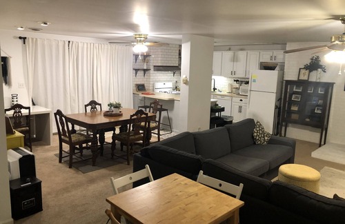 This is a 1000 square foot private entrance two bedroom apartment. It has a large bathroom with a tub/shower. The private entrance with two large side lights (glass) gives a great open feeling and natural light to the great room style just within. It includes a well stocked full kitchen which includes full size appliances including dishwasher, garage disposal, frig, range and small appliances like blender, microwave and not least a Keurig coffee/tea/hot coco maker with a supply of K-cups. A large breakfast bar with stools is handy for visiting with others as you cook. The dining area has multifunction, serving as an eating area with a table with 5 chairs and an office area with desk stocked with some supplies you might need.