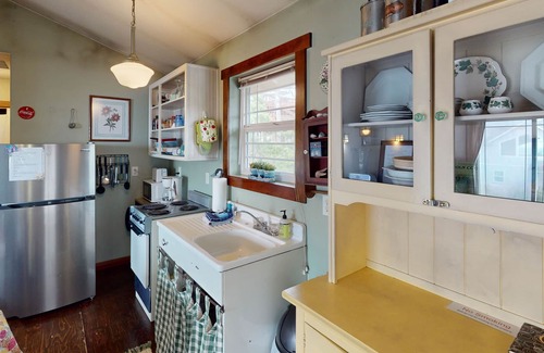 This one-bedroom, one-bathroom home is well-suited for two visitors, though it can accommodate up to three as long as one person is willing to sleep on a sofa. The living room is a cozy space, complete with an electric fireplace, TV with cable and DVD player, a shelf of books, and a sliding glass door that allows great views of the sea. There's even a turntable and a selection of records! A retro kitchen may look compact, but it has all the necessities. This home even has a laundry area, which will come in handy after a few days of playing on the beach.