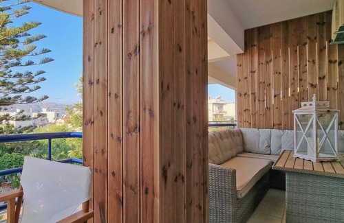 1 balcony with sea view to about 50m from Neo Chora sandy beach, the only direct beach in Chania, a larger balcony overlooking the white mountains, there is also a spacious lounge couch.