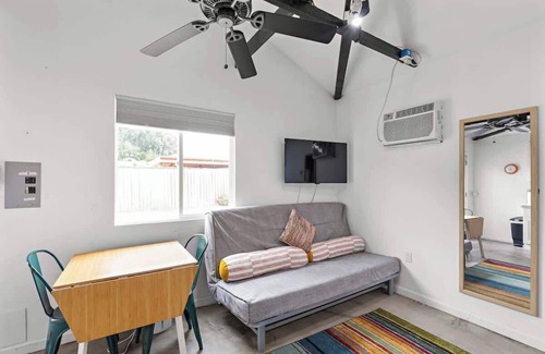 Relax in this private back house, located in a peaceful and central neighborhood. The clean, updated space includes a queen Murphy bed, a small kitchen, a dining area for two, and a smart TV. With a window A/C and portable heaters, you’ll stay comfortable no matter the season. Private entry through the driveway ensures a quiet and secure stay for couples or solo travelers.