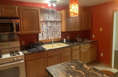 Our cozy home is located in a peaceful, residential neighborhood. Centrally located with close amenities. Our home is only 12 minutes from the Peoria Airport, 13 minutes from our outdoor mall and 15 minutes from OSF Hospital This cozy home is fully furnished with 1 bedroom that has a queen size bed, sofa couch that converts into a small bed, 2 Smart TVs, WiFi, coffee, washer/dryer, & a desk to work at for those who are traveling for business.