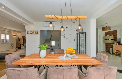 Step inside and immediately feel at home in this well-equipped and welcoming vacation home in Split. At the dining table, the whole family can gather and play games or enjoy a feast. You can also look forward to cozy movie nights on the large sofa. Start the day with breakfast on the terrace and then take a refreshing dip in the pool. In the afternoon, adults can relax with a cool drink on the sun loungers, while children will have many hours of fun and games on the climbing frame in the garden. End the day with a relaxing whirlpool bath in the large bathroom and unwind after all the exciting activities and adventures.