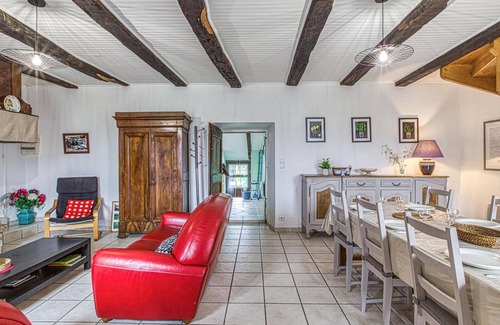 The house welcomes its guests in a fantastic location on the edge of the Lot, close to beautiful nature. The rustic, stylishly furnished rooms provide the ideal setting for a wonderful time together and your dog can also come on vacation here. After an eventful day, relax on the sofa in a cozy atmosphere, watch a movie together and chat for a long time while the flames crackle in the fireplace.