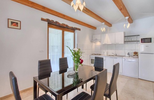 This beautiful family villa Ladonja is located in Sveti Petar u Sumi, a very picturesque village in central Istria. The charming villa is surrounded by the greenery of rural Istria, where you can definitely spend a relaxing holiday in Istria with your family and still be close to all tourist destinations. This fully fenced villa has a pool where you can swim and refresh yourself on hot summer days. You can sunbathe on the deckchairs and enjoy the sun's rays. If you want to prepare an outdoor lunch for your family, there is a barbecue, a terrace and a covered dining area at your disposal. Upon entering the villa, on the ground floor there is a fully equipped and modern kitchen with everything you need to cook a variety of delicacies, a dining area and a living room. On the first floor there are two bedrooms, each with its own bathroom. Villa Ladonja has WiFi and a private car park for two cars. Book your villa in time and enjoy your holiday with the family in a green and peaceful oasis.Villa Ladonja is located in the small Istrian town called Sveti Petar u umi in central Istria. Here it is quiet and relaxing. However, the lively tourist centres of Pore and Rovinj, the beaches, the crystal clear Adriatic Sea and the sights are only a short drive away. Central Istria is known for a landscape of small, picturesque, medieval towns that are irresistibly reminiscent of Tuscany or Provence. Central Istria also offers cultural heritage. Istria and its cycle paths are ideal for cycling. The road connections are excellent. The motorway takes you to Pula or Trieste airports.