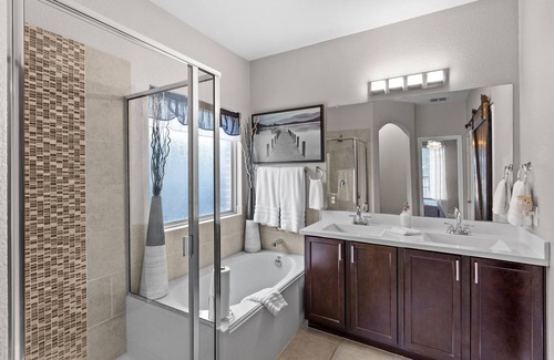 Make yourself comfortable in the master bedroom downstairs which comes with a premium foam mattress and bedding. The Onsuite master bath is equipped with a seperate tub and shower. Also there is a custom closet space.
