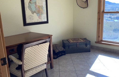 This Texas-style home is located on 5 acres on a hillside with beautiful Davis Mountain views. The location is outstanding. Just 8 min to Davis Mountain State Park, 20 min to McDonald Observatory & 15 min to downtown Ft. Davis. The kitchen is fully equipped with dishes, glassware, utensils, pots, pans, coffee pot, toaster, knives, kettle, microwave, refrigerator, dishwasher, oven and gas stove. There are three bedrooms in this home. One is a spacious master bedroom with a queen sized bed and a sitting room that has a gas fireplace. The other two bedrooms have double beds and are themed: "cowboy bedroom" and "Native American bedroom." All bedrooms contain premium bedding. Both bathrooms are full bathrooms and are quite nice. The guest bathroom has a tub/shower combination and the master bathroom contains a Greek soaking tub. If you need to combine work and play, no problem. There is an office and free Wi-Fi. Feel free to bring your own ether cable to plug right into the modem, if desired. The living room is furnished with red leather furniture, a coffee table, cow hide rug, gas fire place and a 55" Visio television. The dining table seats 6 people. A small bar area seats 2 additional people. The kitchen, dining and living areas are open concept. The views from every window in this house are beautiful. The porch is a wonderful place to sit and enjoy morning coffee while watching for deer or for sipping a glass of wine in the evening while star gazing. Deer often visit the property early in the morning and near dusk. Also, there is a utility room with a large size washer and dryer. You will know that you are in Texas while staying here because of all the unmistakably "Texas" furnishings and overall style. There is a carport suitable for 1 vehicle, and there is additional parking in the circle driveway. Guests staying 7 nights receive a 10% discount. Guests staying 28 nights or more receive a 20% discount. Please come visit!
