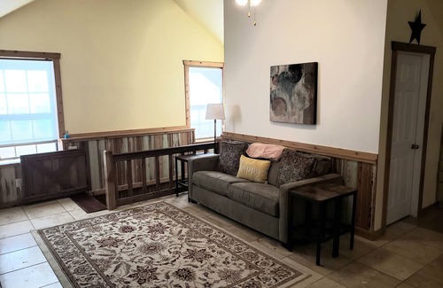 Discover this enchanting 1-bedroom gem in Bastrop. This awesome King Suite features a cozy living room with a sofa bed, perfect for relaxing after a day of exploring. The bedroom boasts a tremendous king bed for a restful night's sleep. With WiFi, heating, and AC, this charming space has everything guests need for a comfortable stay. A great place to call homebase while you're away, we hope you enjoy your stay.
