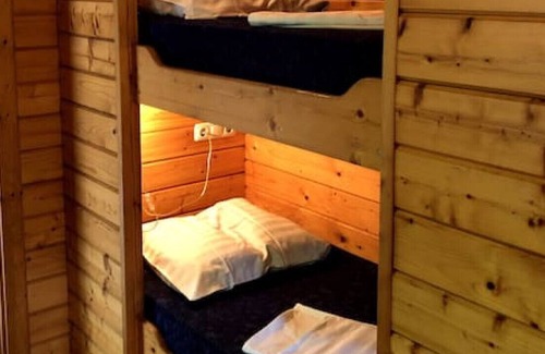 This charmingly furnished log cabin features a spacious terrace and a large green garden. The living room is cozy and has a seating and dining area. There is one bedroom with a double bed and one bunk bed for 2 people in the hallway. The kitchen is equipped with a refrigerator, coffee maker, and a kettle.