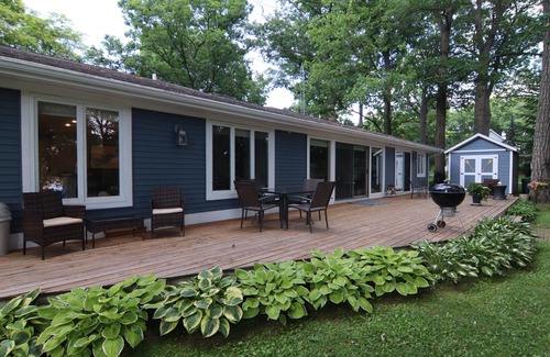 Forget your worries in this spacious and serene space, surrounded by mature trees, namely large oak trees. This ranch-style home offers comfort with its electric fireplace and beautiful views of Green Lake. The wraparound deck and patio space provides plenty of room for relaxing and entertaining. This modern home has an open-concept feel. It is also near a public boat landing and local golf course. Not to mention within walking distance of downtown- with restaurants, marinas, and boutiques. Whether you're exploring the beautiful surroundings or simply unwinding indoors, we think our place will help you experience everything Green Lake has to offer.