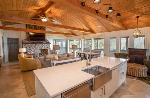 Two fireplaces (one in the living room and one in the Master Bedroom) will keep you warm during cool weather. The great room features a beautiful rock fireplace, large beams, a wood ceiling, granite kitchen counters with bar top seating, and a custom-made wood dining table. 5 O'Clock Somewhere also has a nice backyard, big enough for tossing a ball or throwing a frisbee! Lower-level patio seating and dining is also a plus. You will find a pool table and dart board in the garage. The driveway is flat, and the home is accessed by only a few small steps.