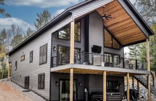 For the ultimate relaxation, ascend to the upper deck where you'll find a gas firepit and outdoor TV, ideal for cheering on your favorite sports teams or simply unwinding with a captivating lakeside view. Meanwhile, the lower level offers arcade games and a luxurious hot tub, ensuring everyone finds their perfect retreat.