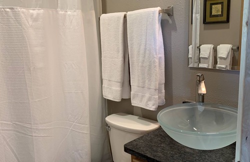Our guesthouse has 2 bedrooms, one with a queen bed and the second is a king bed which can also convert to 2 twin beds. There is a full bathroom with a tub and shower combination.