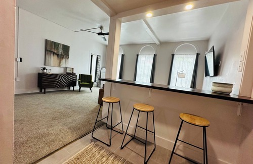 Your stay will be in a beautifully remodeled second story walk up apartment centrally located on Main Street. The apartment features a full kitchen, bedroom, bath, walk-in closet and living room with electric fireplace, WiFi and 65" TV. Don't want to cook in? Then just step out your door and enjoy any of our local restaurant's/bars on Main Street. The steps to the apartment are steep as it is an old historic building….for most it is no problem, however if you have health issues it might be.